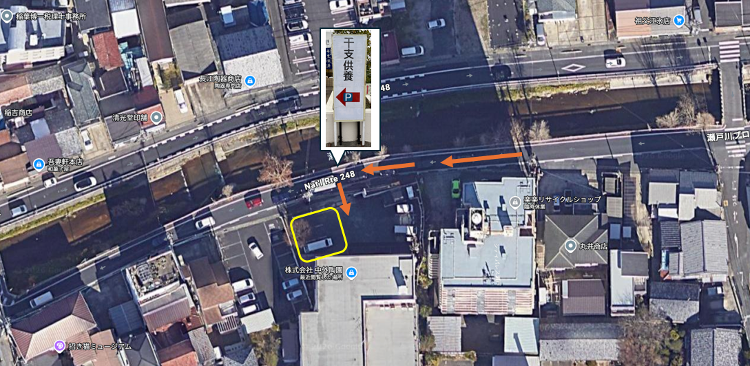 中外陶園本社の駐車場をご利用いただけます。道路沿いに設置しております「干支供養 P」と書かれた縦型の看板を目印にお進みいただき、干支塚前の駐車スペースをご利用ください。